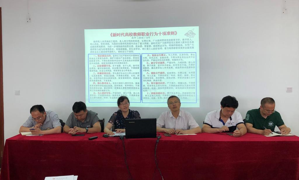 随后,周亚芳书记对《新时代高校教师职业行为十项准则》做了宣传解读。她说,落实立德树人的任务,教师是关键。《高校教师职业行为十项准则》以及《关于高校教师师德失范行为处理的指导意见》,规范了教师行为的底线,是每个教师必须遵守的规矩。全院教师一定要充分认识教师职业的神圣使命,以《准则》为准绳,坚持正确的政治方向,培养高尚的道德情操,提升自己的人文素养和专业水平,促使教师队伍更加纯洁,更加风清气正,更加得到社会的尊重和敬爱。