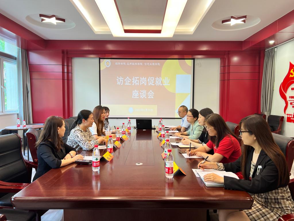 为促进毕业生更加充分更高质量就业,进一步深化校企合作,5月20日中午,应用数学学院、经济学院、信息工程学院联合开展“访企拓岗促就业”专项行动,邀请北京中植基金销售有限公司、南京博涯信息有限公司、嘉环科技股份有限公司等三家企业相关负责人在德经楼329会议室座谈交流。三所学院的副书记、学工办主任以及学生代表参加了座谈会。