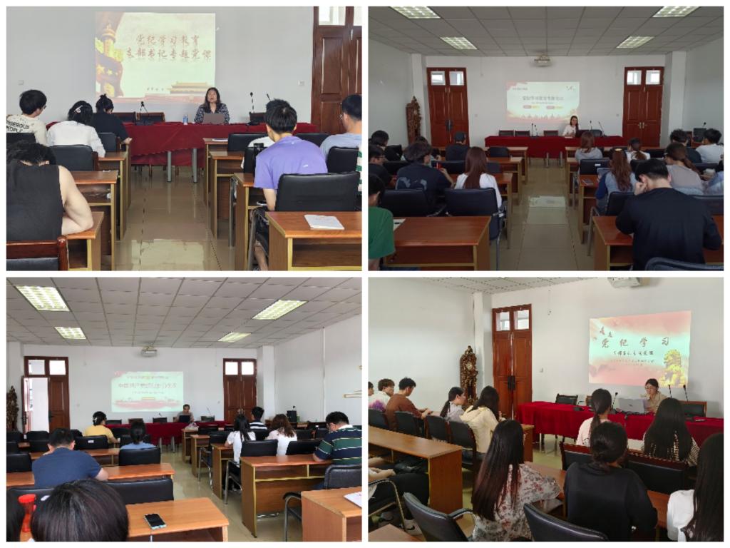 本科生第一党支部书记张婷结合同学们日常学习生活中的具体实例讲解了《中国共产党纪律处分条例》,希望年轻的学生党员和积极分子要深入研读党章党规,结合学习和生活实际不断加深对党的纪律规矩的理解与认识,将党规党纪内化于心、外化于行;要心存敬畏,行有所止,以身作则,坚守底线,筑牢纪律防线,彰显党员本色。