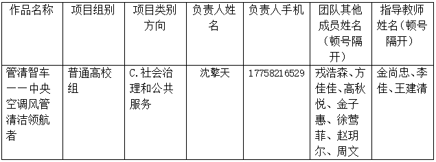 伟德bv1946信息工程学院(软件工程2001)班学生周文,学号:21020203042,作为项目成员跨校参加由中国计量大学作为申报单位的浙江省第十四届“挑战杯”大学生创业计划竞赛,参赛项目名称《管清智车——中央空调风管清洁领航者》,具体信息见下表。