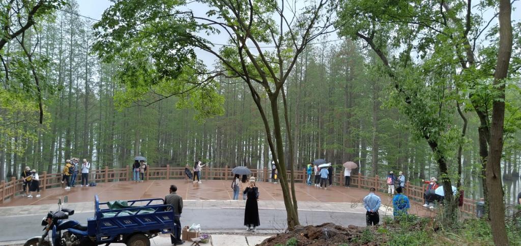 出了纪念馆,由于雨太大我们没能够看见玫瑰花海,但我们看见了路上一座座随风而转的风车,看见了悠远的大泉湖。10点50分,同学们在淅淅沥沥的小雨的伴随中,撑着雨伞走进了第三站——止马岭,在那里,同学们看见了罕见的湖中坚挺的水杉树,纷纷拿出手机拍照,感受大自然的美丽和无尽乐趣。