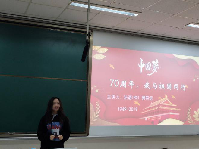 2019年10月22日18:30,信息工程学院于博远楼308教室组织以“70周年,我与祖国同行”为主题的“开学第一堂团课”。本次课程由外国语学院黄笑语同学担任主讲人,信息工程学院分团委与大一新生参与学习。我院本次新生团校第一讲主要分为四个部分。