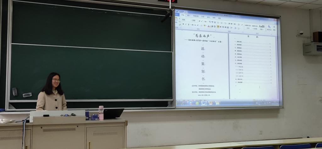 首先,主持人于秋雨简单介绍了策划案应用于不同场合和活动,强调做好策划案十分重要。接着放了一小段视频,视频幽默风趣地点明封面美化和目录的重要性。然后于秋雨学姐结合PPT和“十佳歌手”策划案,分块讲解了策划案的准备,模板和注意事项。其中,主持人详细讲解了策划案四个组成部分——封面、目录、正文和附件,并且分享了自己的经历,比如目录的点如何打出,正文主题需要创新和抓人眼球等等。