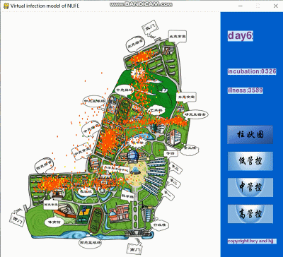 该模型基于南财地图,以python为编程工具,同时使用pygame引擎,模拟在低、中、高三种管控下的校园疫情传染情况。模型中设置健康、潜伏期、患病三种人群,在寝室、教室和食堂三个区域移动的场景,采取没有措施的低管控、戴口罩等低级防护的中管控、增设隔离区等严密防护的高管控三种场景,实现在不同传染率下的模型。通过实现可视化的GUI、学生活动随机化的算法、使用字典的检测优化算法,以及人员分布数据的图表等,使大家更直观清晰的获得校园里同学们流动下的传染状况,同时提醒各位同学,在校期间,服从学校管理,务必在宿舍进行自我隔离,做好个人防护,尽量减少出行,避免校园里扩大感染范围。