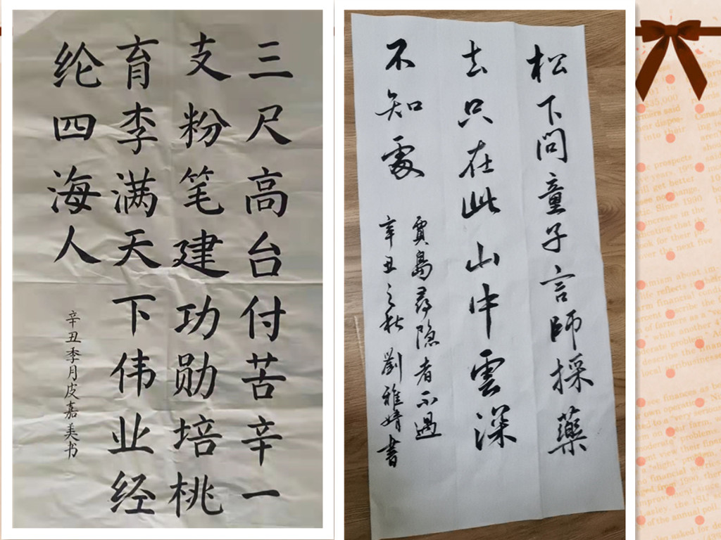 “一笔书感恩”。计算机1901班刘雅婧和大数据1901班皮嘉美通过书法作品书写自己对老师的敬佩和崇敬,将感恩之情寄托在艺术作品之中,崇敬之心跃然于纸上。“培桃育李满天下,伟业经论四海人”正是对老师一生事业的真实写照。