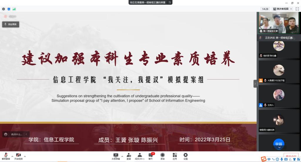 经过前期选拔,共有6组提案代表团与6组评审代表团来到线上比赛现场。提案代表团依次向大家陈述案由、案据以及相应的建议与措施,为我们的身边事建言献策;评审代表团相应地以极具批判性的思维审视提案,找出其中不足,并给出建设性的建议,展现了信工学子敏锐的洞察力、缜密的逻辑性以及具有一定高度的人文情怀。