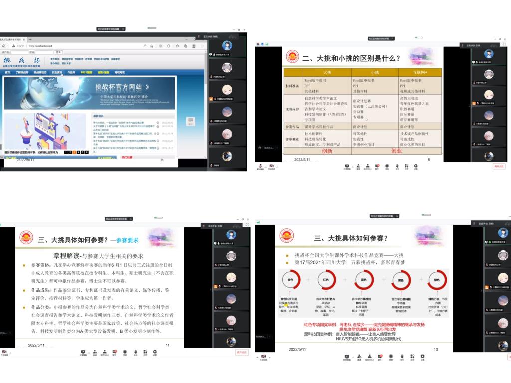 最后,张银老师还结合指导团队参赛经历,分享了如何开启“挑战”之旅,对项目升级孵化给出了建设性建议,并解答了同学们对于“挑战杯”竞赛的困惑。他鼓励同学们充分发挥专业特色与优势,勇于创新、积极探索、大胆实践,在创新创业竞赛中放飞自己的青春梦想。