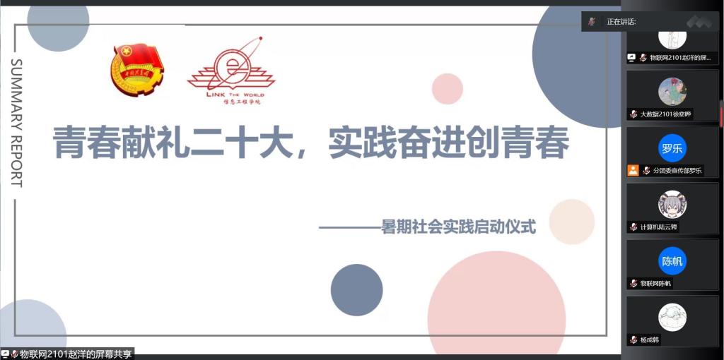 为扎实开展好“喜迎二十大,永远跟党走,奋进新征程”主题社会实践暨2022年暑期“三下乡”社会实践活动,5月25日,信息工程学院开展了“青春献礼二十大,实践奋进创青春”主题团课暨暑期社会实践专题培训,学院2020级和2021级全体同学分别在线上和线下参加培训。