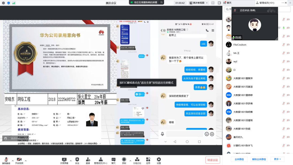 为贯彻落实企业和我院关于毕业生就业工作的决策部署,全力促进毕业生更加充分更高质量就业,全面深化企业合作,5月27日下午,南京艾瑞集团陈韩老师对信息工程学院毕业生进行线上就业指导,会议号707 553 377,18级全体学生参加了此次活动。
