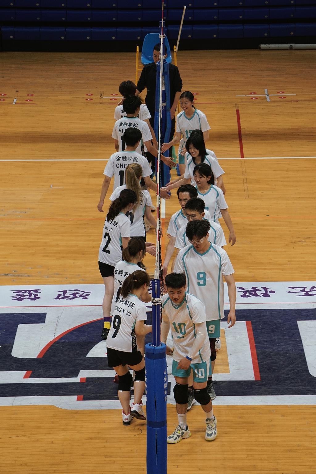 终局,战况更加焦灼。我方球员连续下球,凭借高质量传球,找准落点精准发后区,像“手术刀”一样猛攻金融肋部。金融院队二号位试探斜线,配合快球扣击,紧追不舍。我方顶住冲击,串联防守以及拦网进攻更胜一筹,逐渐掌控战局,稳住节奏。负伤的五号球员依旧防守出色,并抓住机会适时反击。九号球员承担一传的同时进攻依然犀利,利用扣球得分。局点,我方利用快球掩护两边拉开,攻手背飞得分,以15:11的比分拿下终局。最终以2:1的成绩取得伟德bv1946第一届排球联赛的第一名。