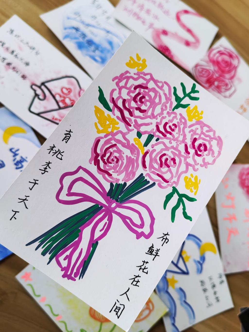 志愿者们用心绘制每一张明信片,每一句祝福,希望能够将自己的感激和祝福通过文字与绘画传递给老师们。“老师,您是我人生路上的指南针,感谢您的教导和陪伴。”“亲爱的老师,您的辛勤付出无法言表,希望您健康快乐,永远年轻!”志愿者们将自己的明信片交到老师手中,表达自己最真挚的情感。