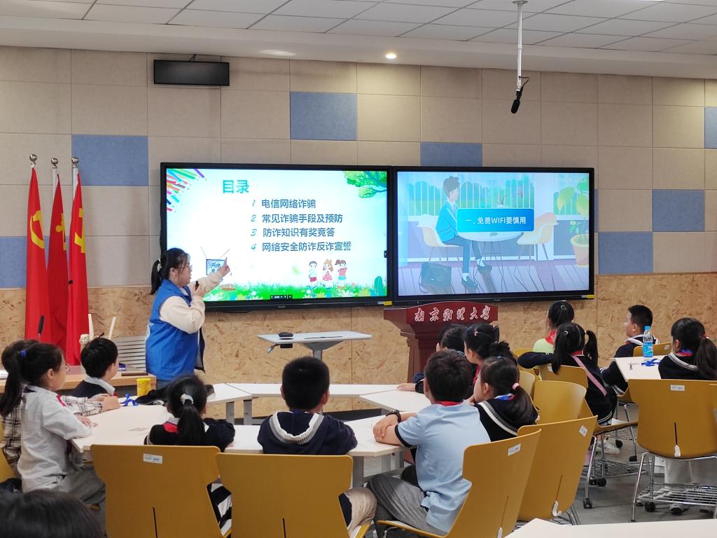 在博文楼101智慧教室“防网络诈骗,筑安全防线”主题宣讲课堂上,主持人薛怡宁以小朋友们日常使用网络的情况引入话题,结合现实案例和宣传视频,普及网络安全知识,提醒小朋友们培养防范意识,同时结合自身信息工程学院专业特色,带领小朋友们识破网络诈骗手段。