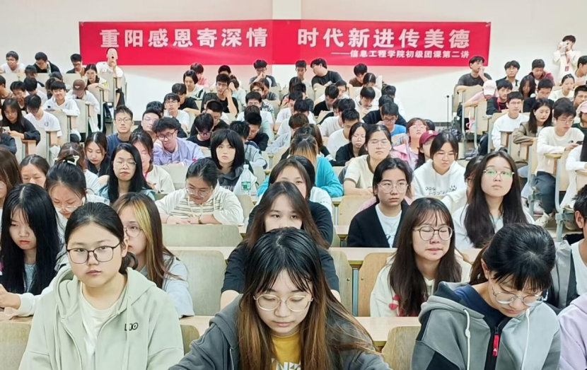 净境重阳节,仙游万乘来。为使同学们能在大学新阶段更好地认识重阳节,坚持传承传统节日,传递爱老敬老精神,10月19日,信息工程学院在博观楼110开展“重阳感恩寄深情,时代新进传美德”初级团课第二讲。