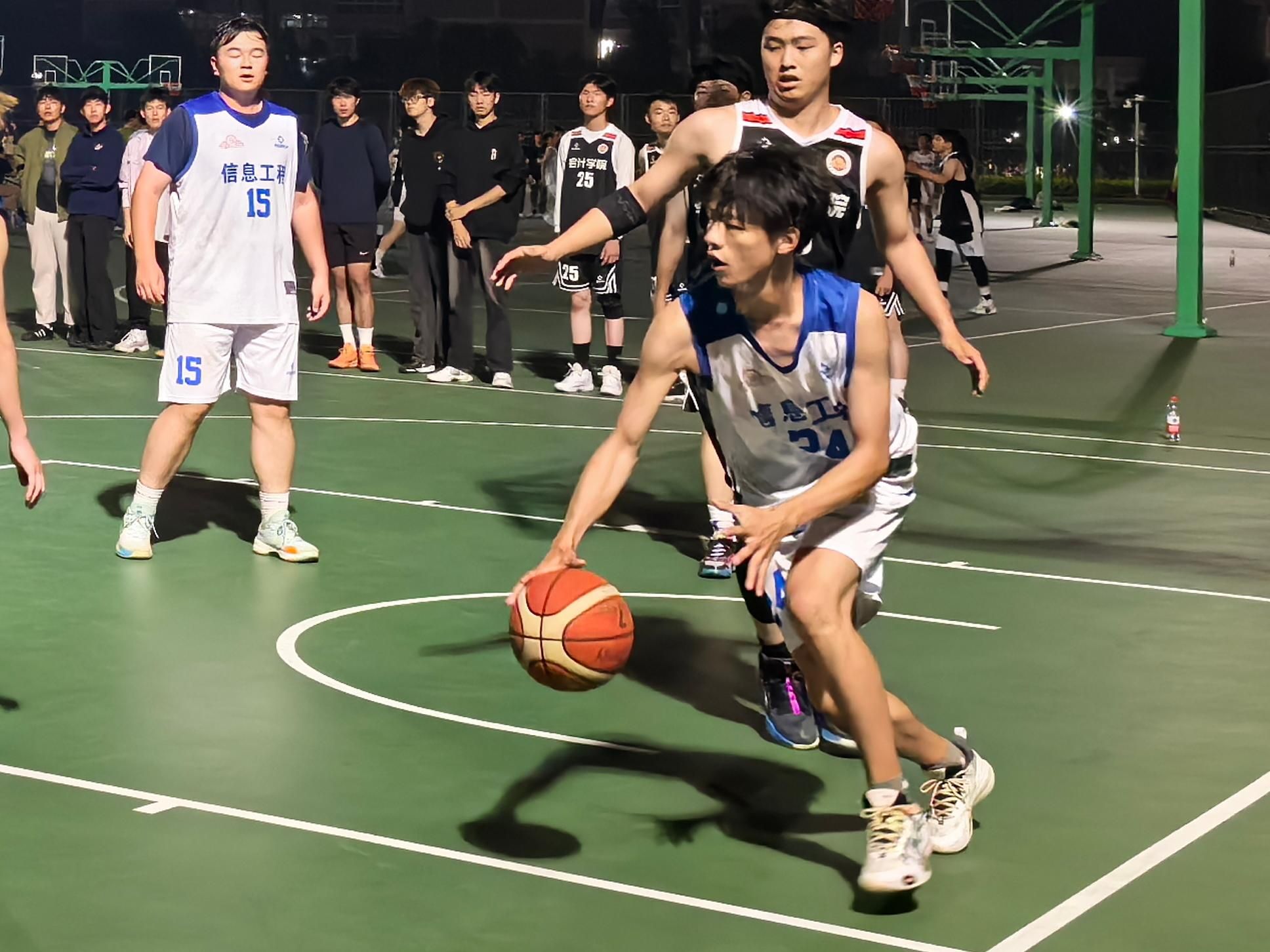 赛场上,球员们团结合作、拼尽全力,为争取每一个得分机会而奋斗。24号球员展示了惊人的突破能力,他巧妙地运球过人,迅速在对手的防守间隙中找到空位,展现了个人速度与灵活性的完美结合。队友们在他身后严密防守,整个团队的合作默契十足。比赛中,4号球员也发挥了关键作用,他面对对手33号球员的贴身防守,依然冷静沉着,用敏捷的步伐迅速突破防线,为队伍争取了宝贵的得分机会。这一刻,赛场上紧张的气氛达到了高潮,观众们都为信息工程学院的精彩表现所折服。