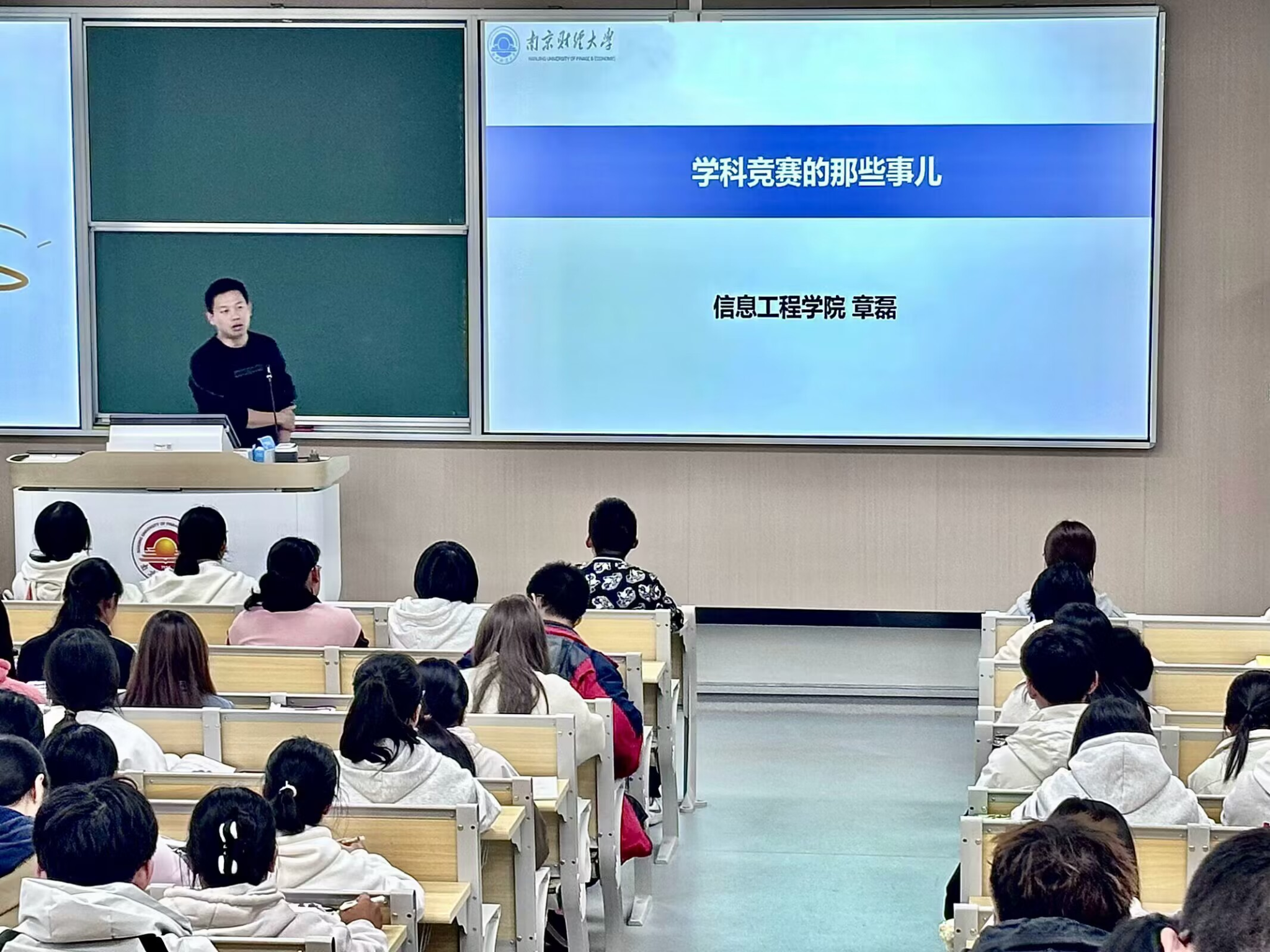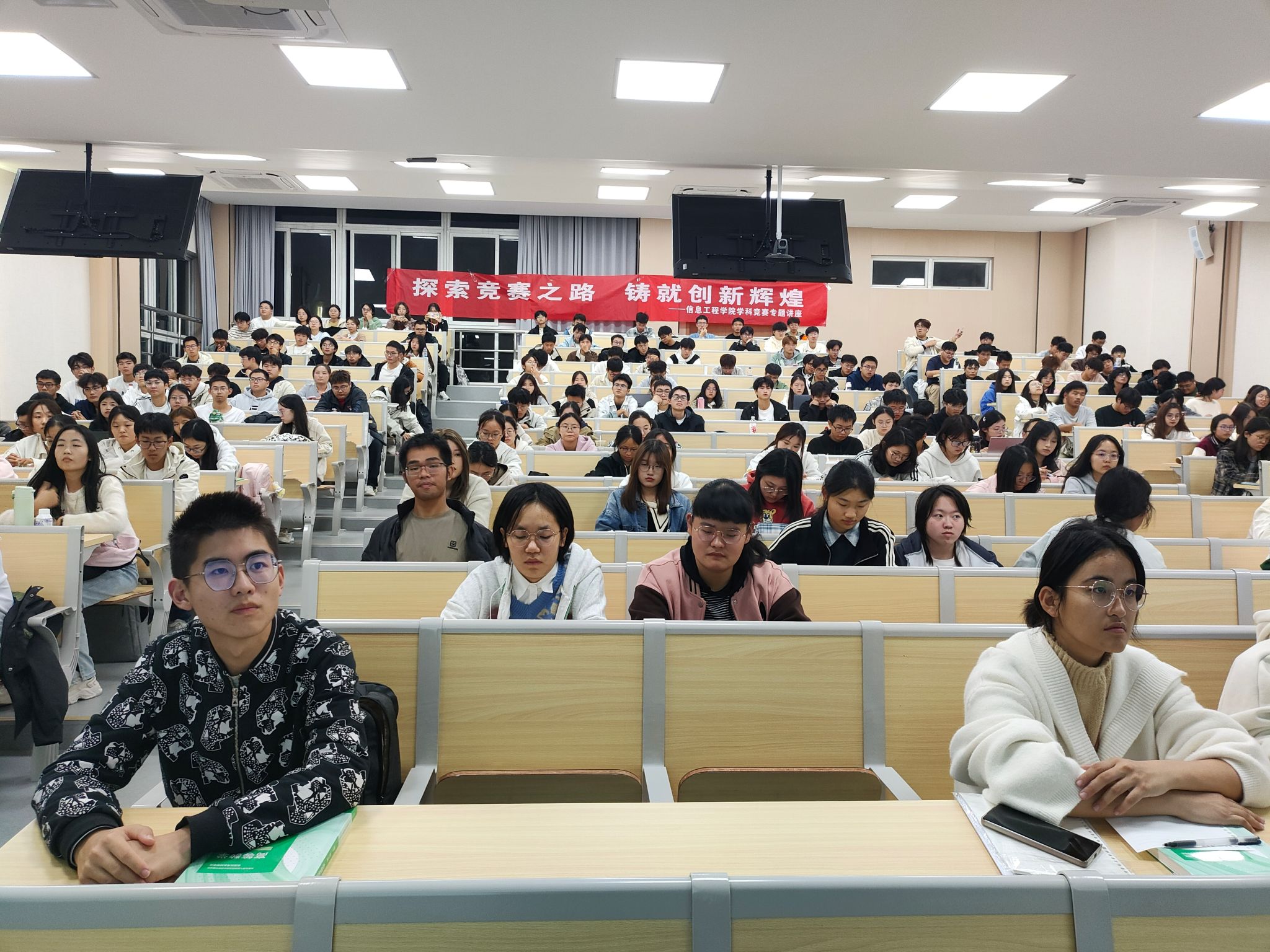 为加快培养创新创业人才,提高信工学子参与科创竞赛的能力和水平,为校园科技创新氛围注入新的活力,10月23日晚,信息工程学院在博观楼202室开展“探索竞赛之路,铸就创新辉煌”学科竞赛专题讲座。讲座由e路领航辅导员工作室主办,信息工程学院机器人实验室负责老师章磊主讲,2024级全体新生参加。