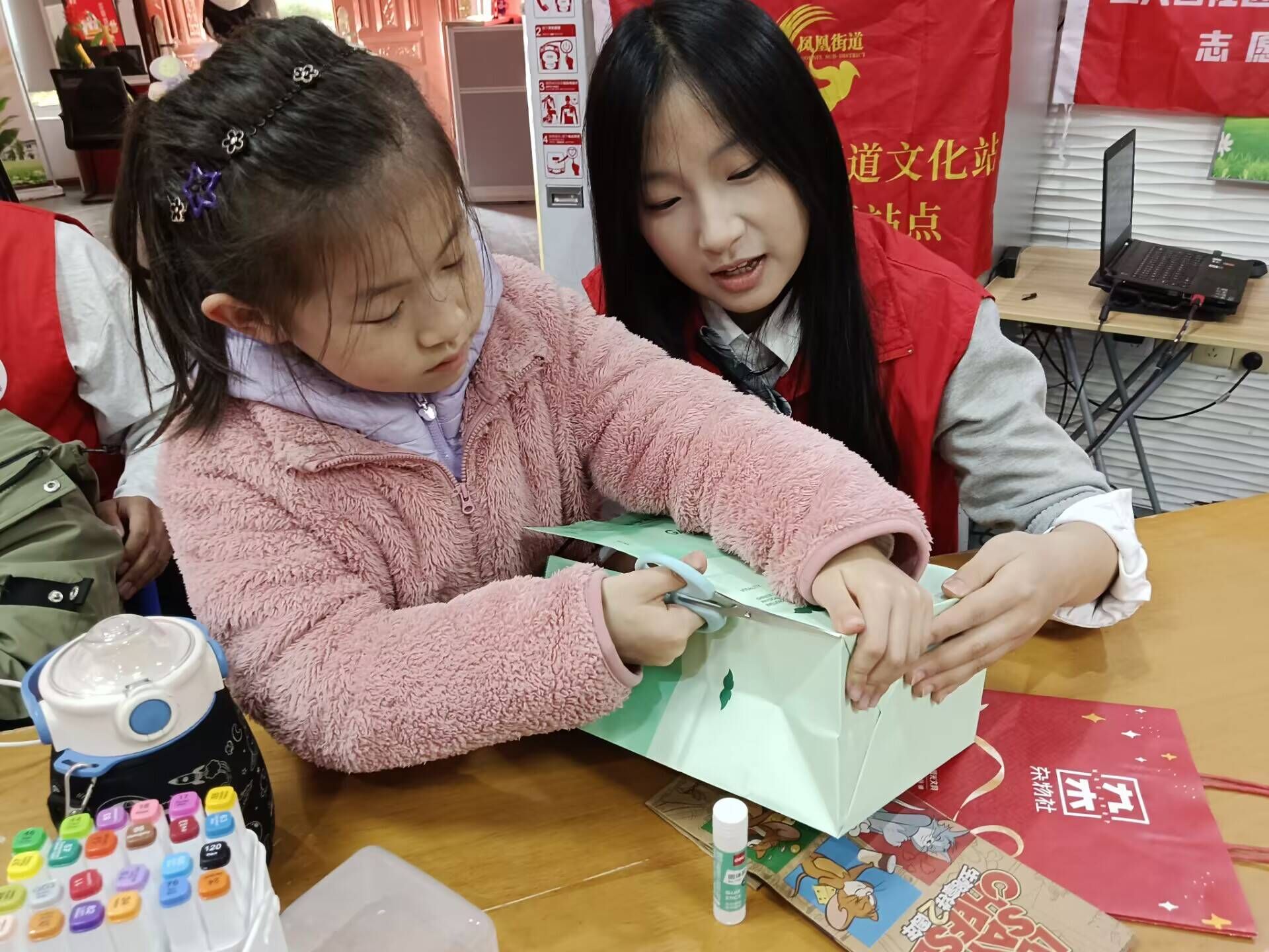 随后,志愿者们组织了一场别开生面的旧物改造活动。他们为小朋友们准备了旧的纸袋、画笔、胶布、剪刀等手工物品,引导他们用旧物完成手工作品。小朋友们兴致勃勃地投入到创作中,充分发挥想象力,将废弃的纸箱改造成可爱的小动物、美丽的花篮等手工作品。在志愿者的帮助下,小朋友们不仅学会了旧物利用的方法,还体会到了变废为宝的乐趣。