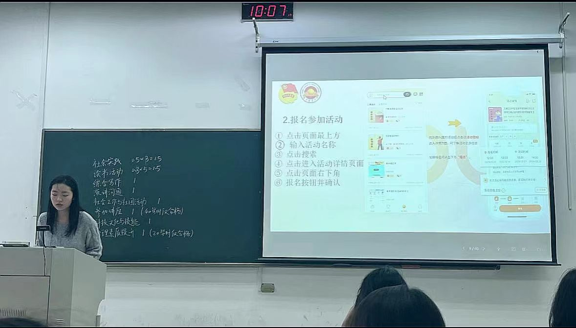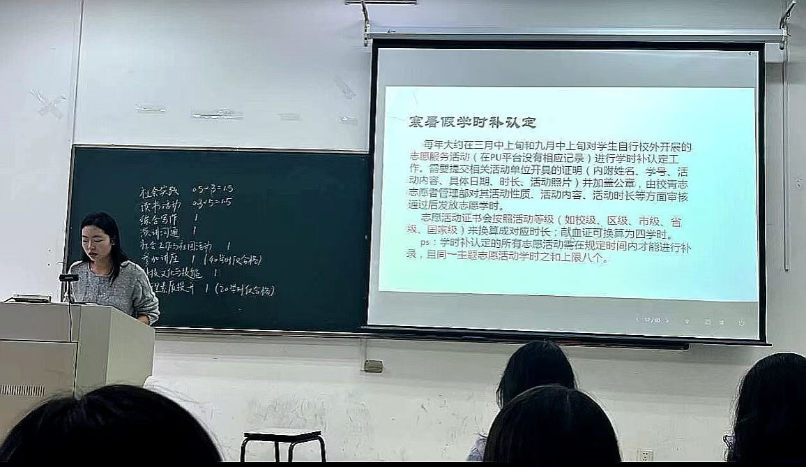 培训会上,主讲人首先围绕“PU平台使用指南”展开系统讲解。她指出,PU平台是记录学生参与第二课堂活动、获取相应学时学分的重要信息化载体,其活动主要分为“活动类”与“申请类”两大类别。活动类涵盖青年大学习、团支部活动、讲座、演讲沟通、志愿服务、心理活动等多种形式,流程包括“发起活动—审核—开展(签到)—申请完结—发放学时”;申请类则包括科技文化与技能、社会工作与社团活动、参加讲座、演讲沟通(免测)等,学生可主动提交证明材料,经审核后获得相应学时。主持人对重点部分进行强调,清晰了解活动分类与流程,有助于同学们合理规划课余时间,有序参与各类素质拓展项目。