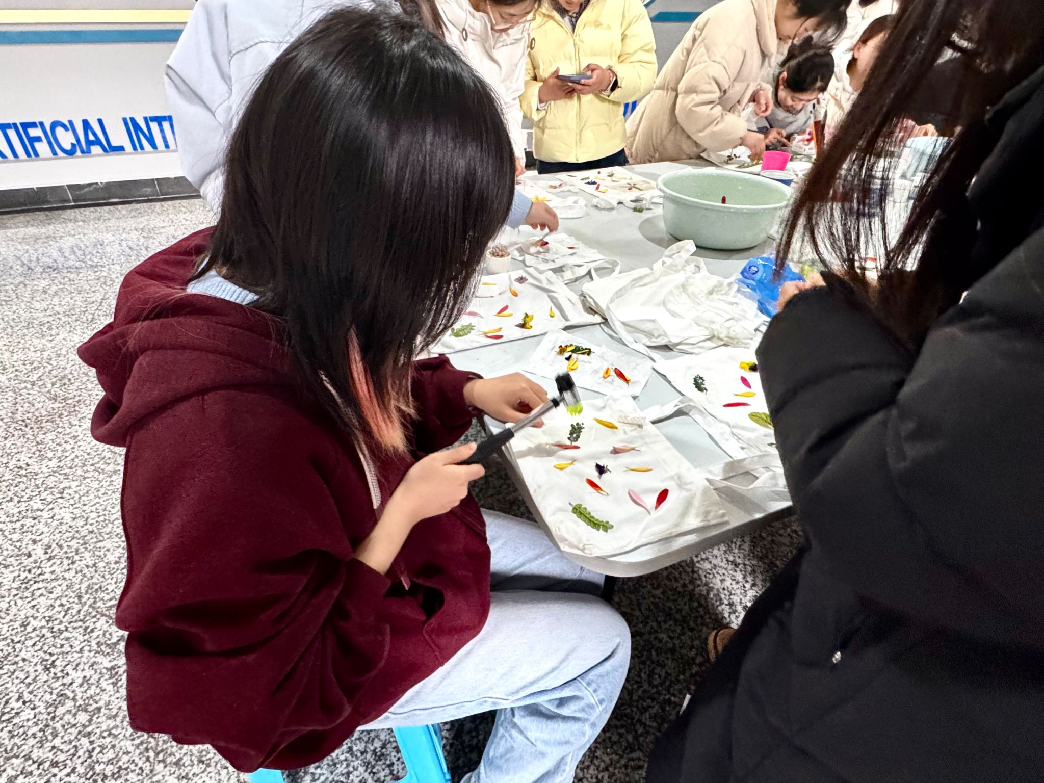 3月11日,德业楼内两场特色活动同步开展,为植树节系列活动拉开序幕。在四楼大厅,“一抹新绿・植愈青春”创意绿植活动热闹开启。活动以“伴植成长”植物领养计划为开端,同学们有序领取多肉植物或郁金香种球,认真聆听植物养护讲解,纷纷许下用心呵护 “绿色伙伴”的承诺。学院素质拓展中心还专门建立植物成长交流群,为同学们定期科普养护知识,鼓励大家每周打卡分享植物生长状态,让陪伴与坚持成为青春的必修课。随后,“植语拓痕”植物拓印帆布包创意工坊将现场气氛推向高潮,新鲜的叶片、花瓣搭配环保颜料与纯白帆布包,同学们在工作人员的指导下自由创作,或勾勒叶脉纹理,或叠加渐变色彩,让科技感与自然美在帆布包上完美融合,一个个独一无二的环保文创作品新鲜出炉,在创意表达中定格自然之美。