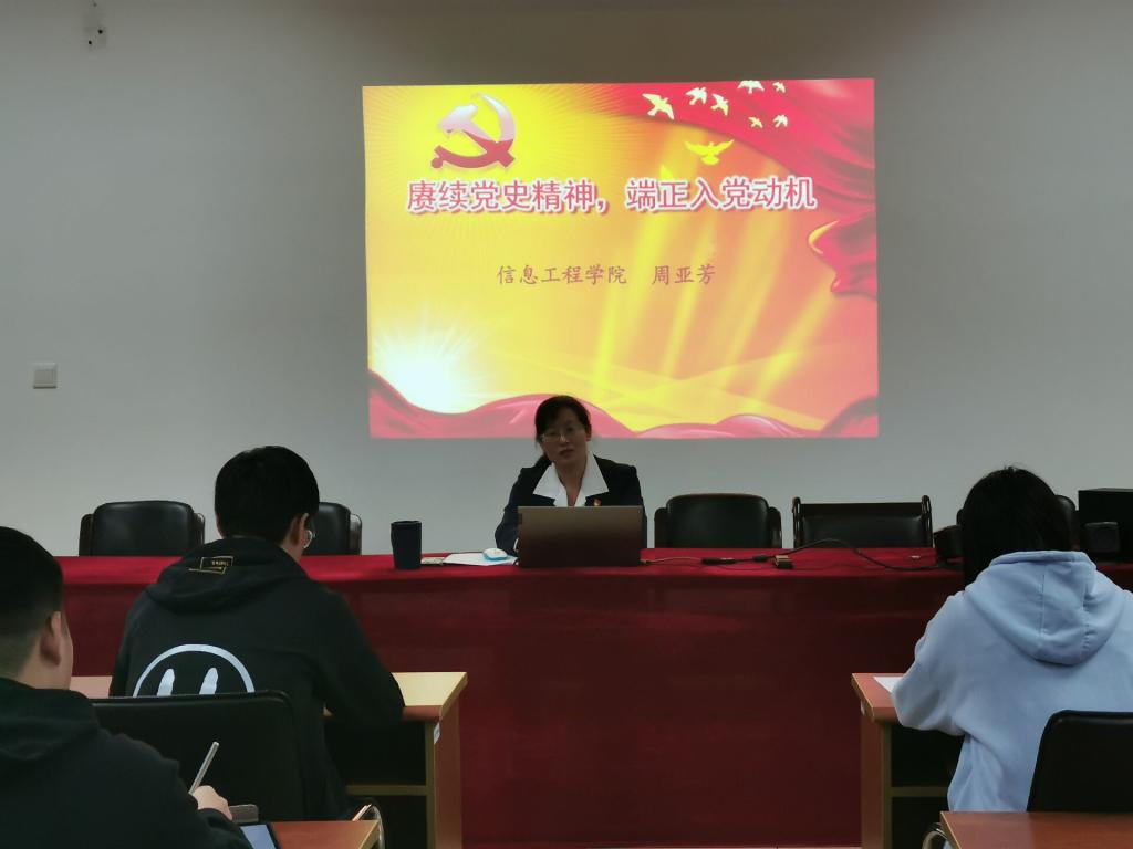 2021年10月20日下午,信息工程学院党委书记、本科生第一党支部政治辅导员周亚芳在德业楼406会议室,以“赓续党史精神,端正入党动机”为题,给2021年下半年“党的发展对象”培训班的学员们上了一堂专题党课。