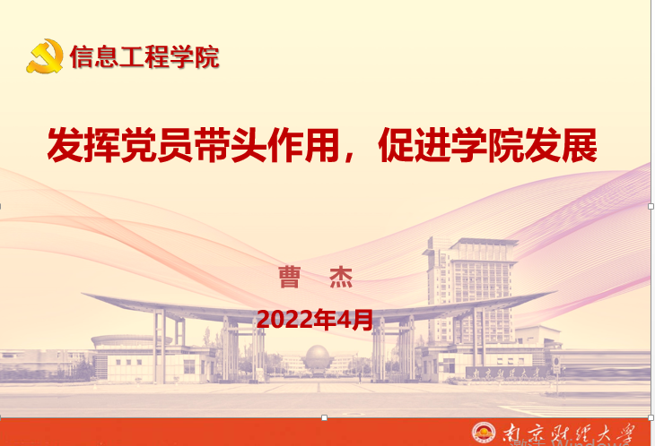 2022414日晚,信息工程学院院长、本科生第二党支部政治辅导员曹杰教授通过网络平台,以“发挥党员带头作用,促进学院发展”为题,给2022年上半年“党的发展对象”培训班的学员上了一堂专题党课