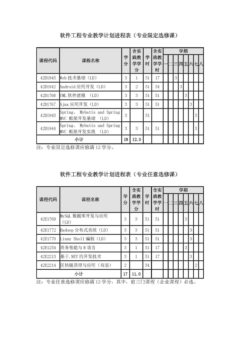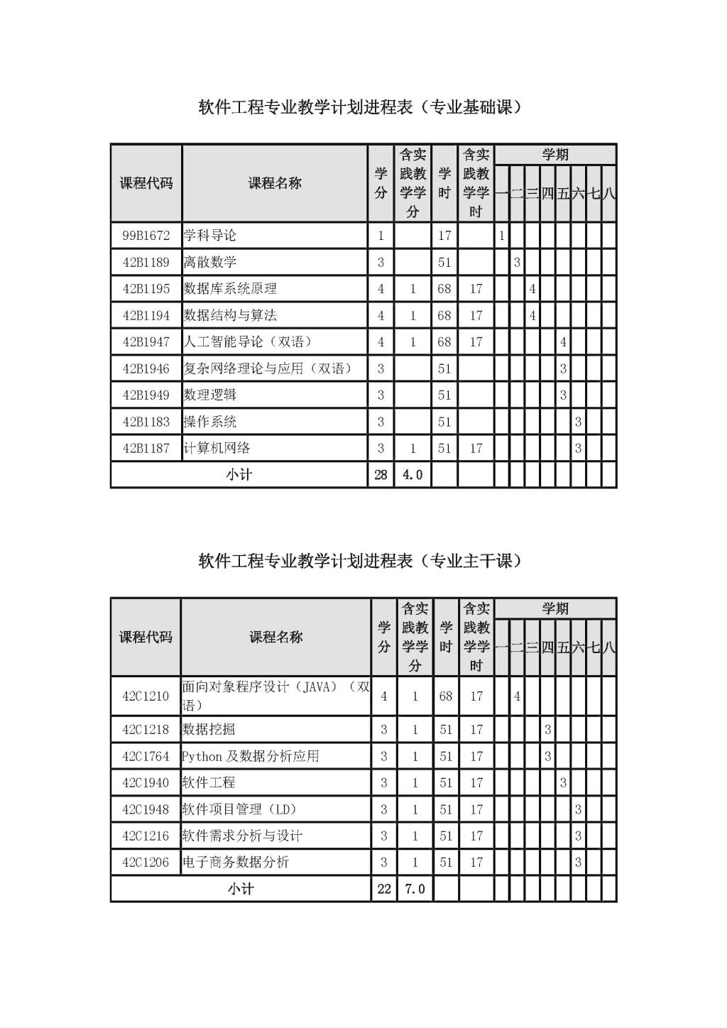 总体课程设置强调计算机科学与软件开发技术的结合和复合应用,具体课程包括离散数学、数据结构与算法、数据库系统理论、数理逻辑、人工智能导论、复杂网络理论与应用、操作系统、计算机网络、面向对象程序设计(Java)、数据挖掘、Python及数据分析应用、软件工程、软件需求分析与设计、软件项目管理、电子商务数据分析、Web技术基础、Android应用开发、UML软件建模、MySQL数据库开发与应用、Ajax应用开发、Linux Shell编程、Hadoop分布式系统、Spring & Mybatis & Spring MVC框架开发基础(实践)等。