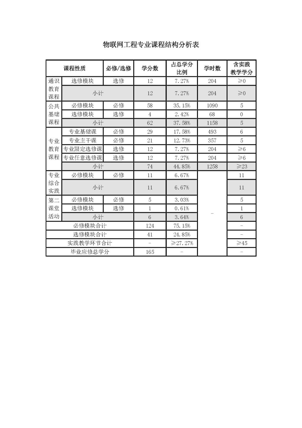 (一)公民素质与职业道德培养要求: 1.学习和掌握马列主义、毛泽东思想、邓小平理论和“三个代表”重要思想,以科学发展观指 导自己的工作和学习; 2.自觉维护国家和人民的利益,为祖国社会主义现代化建设服务; 3.模范遵守社会公德、法律、法规和职业道德; (二)知识与能力培养要求: 1.具备一定的人文科学、社会科学和自然科学的知识和素养; 2.具有较扎实的自然科学基础、较好的人文科学基础和外语语言综合能力。掌握资料查询、文 献检索及运用现代信息技术获取相关信息的基本方法;具有一定的技术设计、归纳、整理、分析实 验结果,撰写论文,参与学术交流的能力; 3.掌握物联网工程专业的基本知识和基本原理; 4. 能熟练掌握物联网系统的实际应用工作,熟悉物联网技术的软硬件配置; 5.具有较高的物联网应用开发能力,能从事物联网的系统设计、开发、管理和物联网软件开发 工作的高层次应用型专业技术人才; 6.熟悉经济、管理以及以互联网+、大数据为代表的下一代信息处理与分析技术等方面的基本 知识; 7.熟练掌握一门外国语,具有本专业领域较强的外语综合应用能力; 8.具有良好的沟通能力、语言表达能力和团队协作能力。 (三)身体与心理素质培养要求: 1.掌握一定的体育基础知识; 2.掌握科学锻炼身体的基本技能; 3.具有良好的体育锻炼和卫生习惯,身体健康; 4.掌握一定的心理学基础知识、技能和方法; 5.尊重生命,关爱他人; 6.理性、严谨,乐观、开朗。