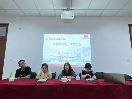 63日上午,信息工程学院研究生优秀毕业生分享交流会在德业楼406拉开帷幕。研究生党支部邀请到2017级四位优秀毕业生刘笑雨、倪琦瑄、唐慧和孙静勇同学进行经验分享,研究生各年级学生参加了此次分享会。
