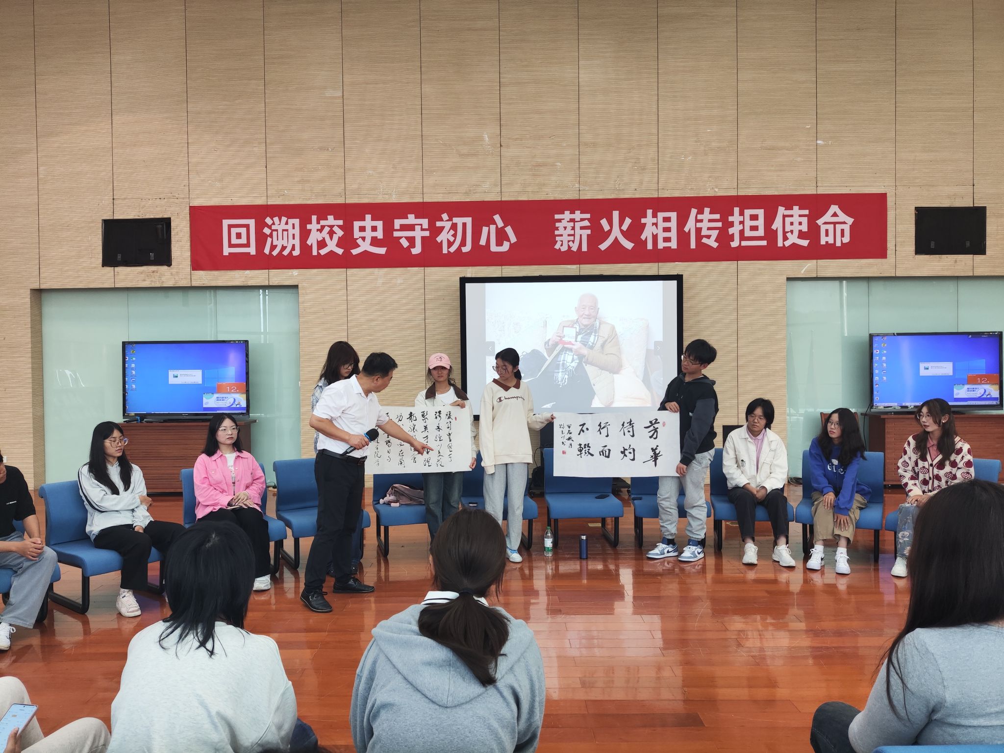 分享会的最后,冯玉川老师向同学们赠送了书法作品“芳华待灼,行而不辍”,勉励同学们要践行“自谦、自信,务实、超越”的校训精神,在人生道路上要珍惜青春,不懈奋斗,书写自己的青春华章。