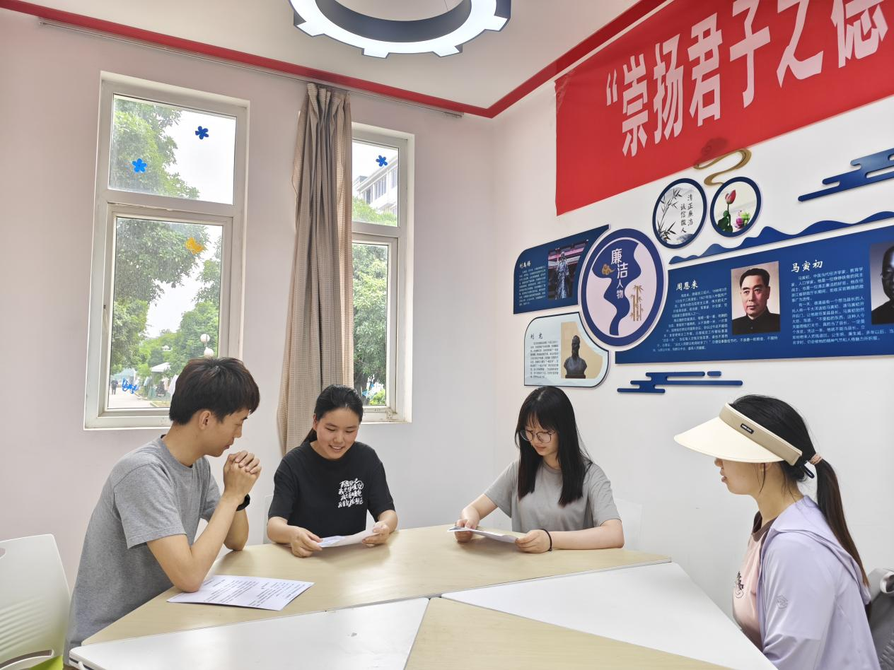 15号宿舍站党建联盟工作站内陈老师与三位学生围坐修改简历